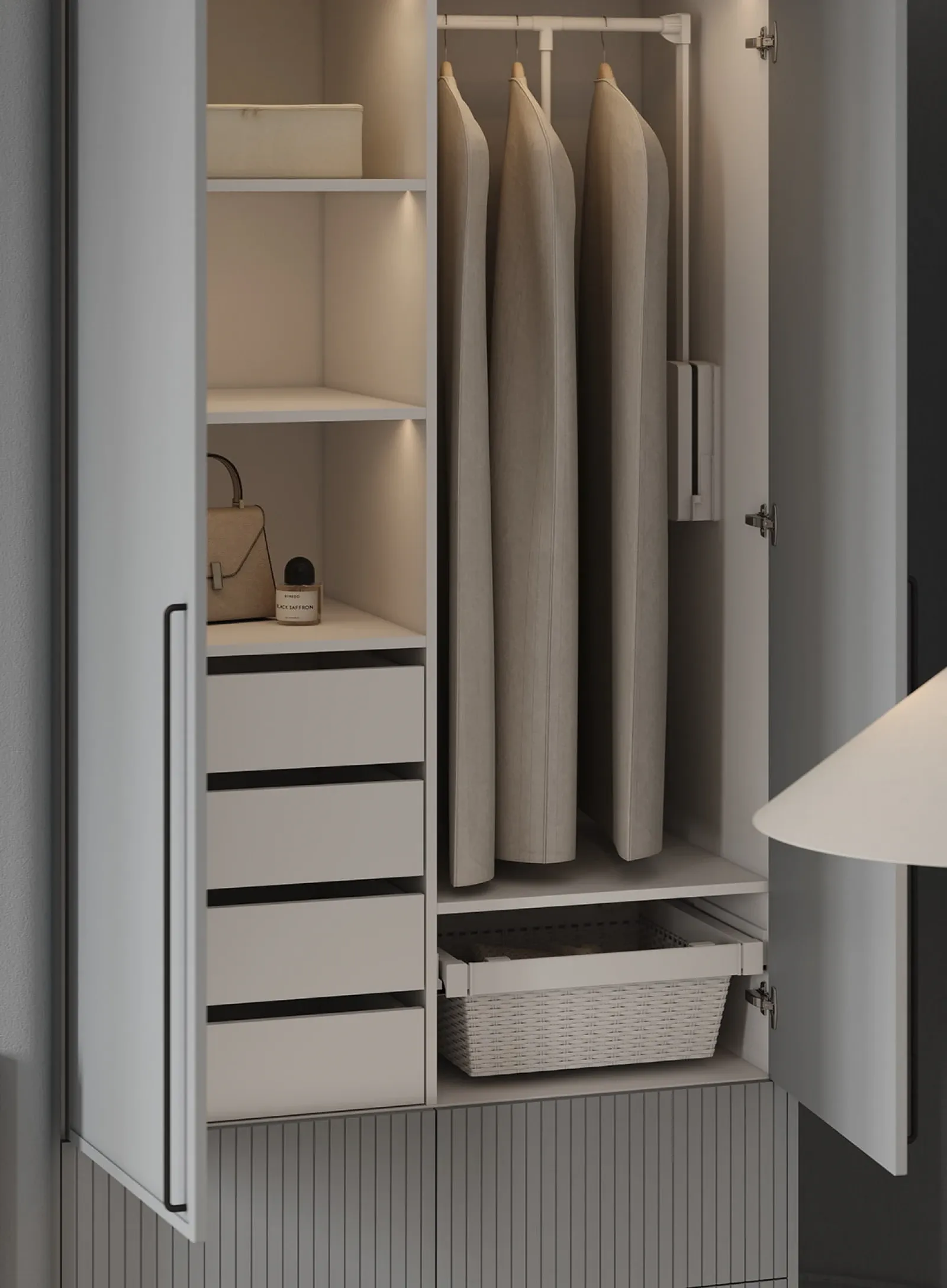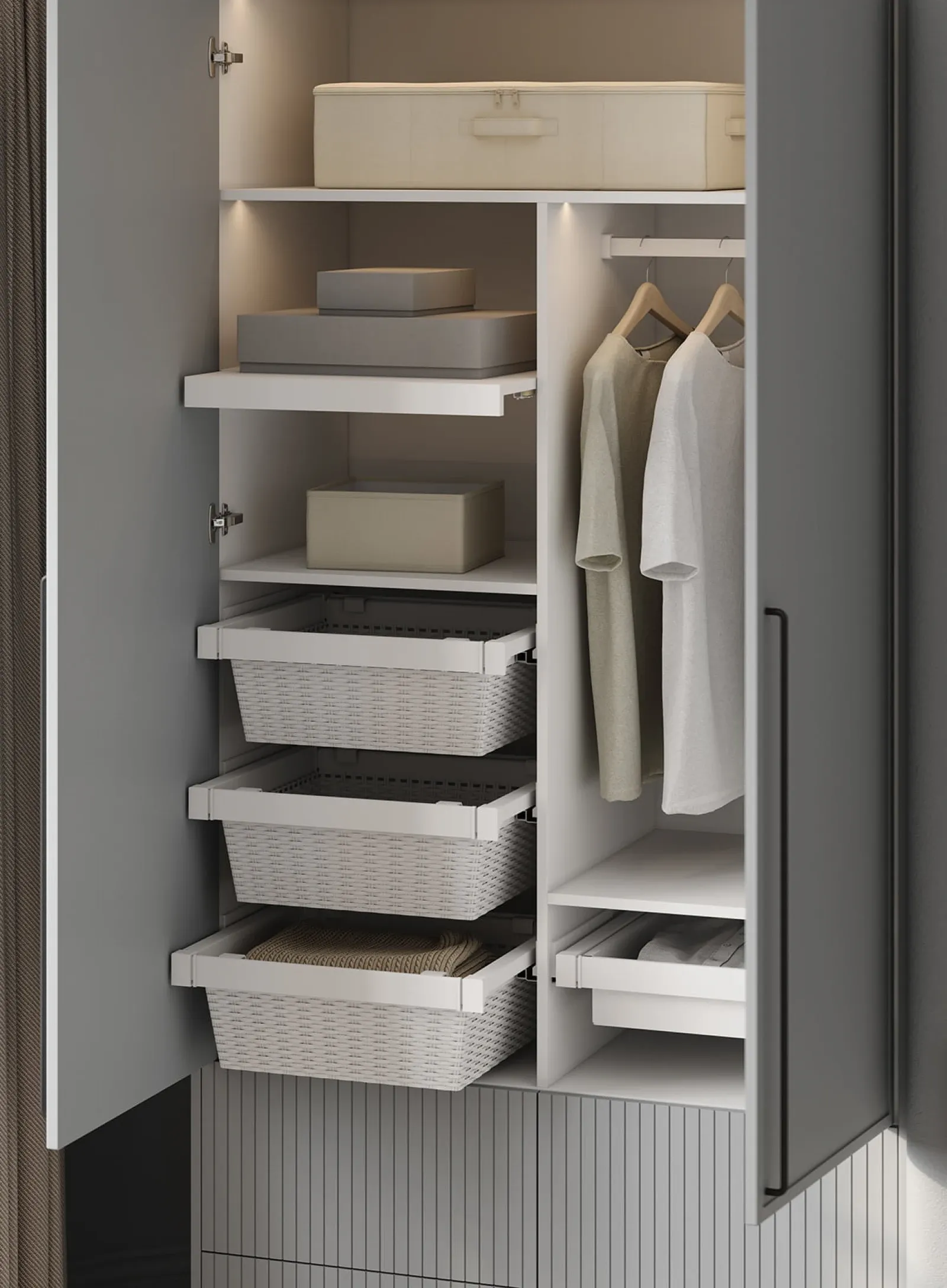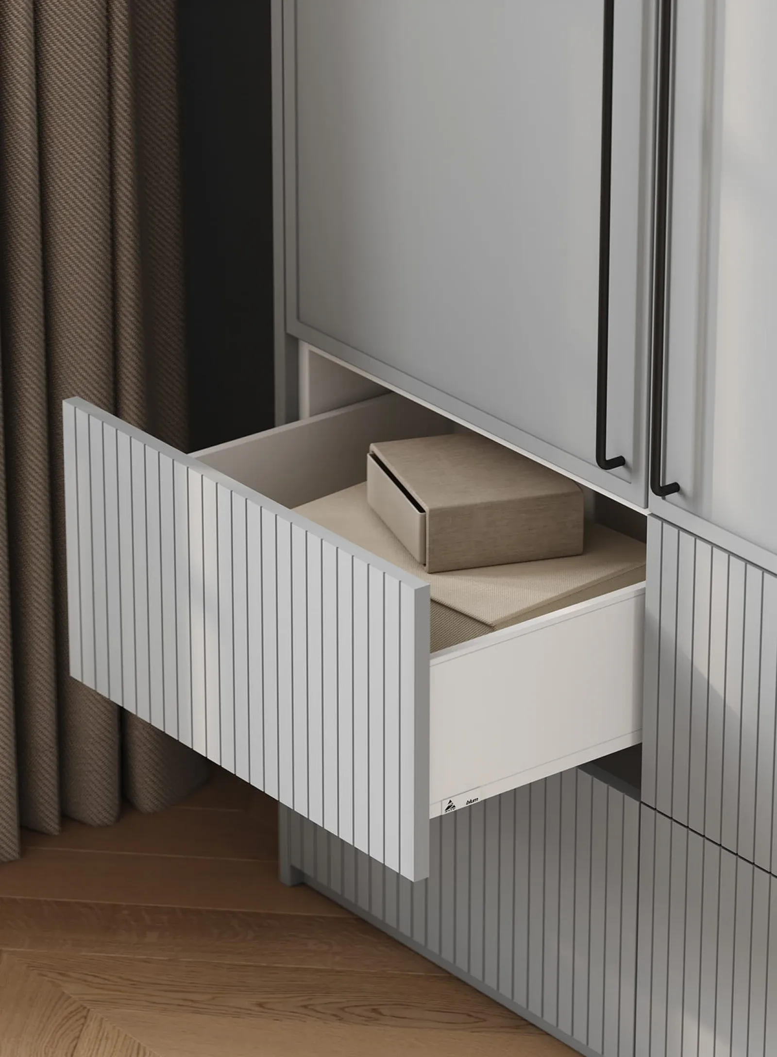 КАРКАС, ПОЛКИ, ВНУТРЕННИЕ ВЫДВИЖНЫЕ ЯЩИКИ, ЗАДНЯЯ СТЕНКА ЛДСП, цвет Белый Премиум / Белый ФАСАДЫ Рокси (крашеная МДФ) / Аврора (крашеная МДФ), цвет NCS S 2005-B Матовый