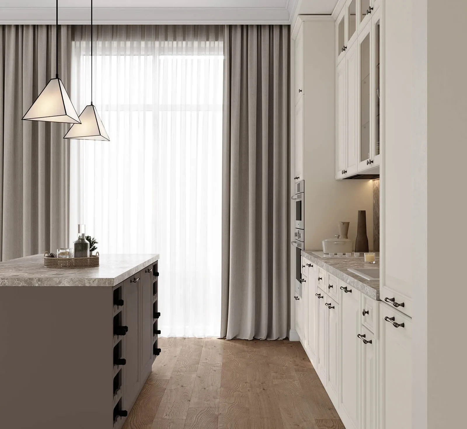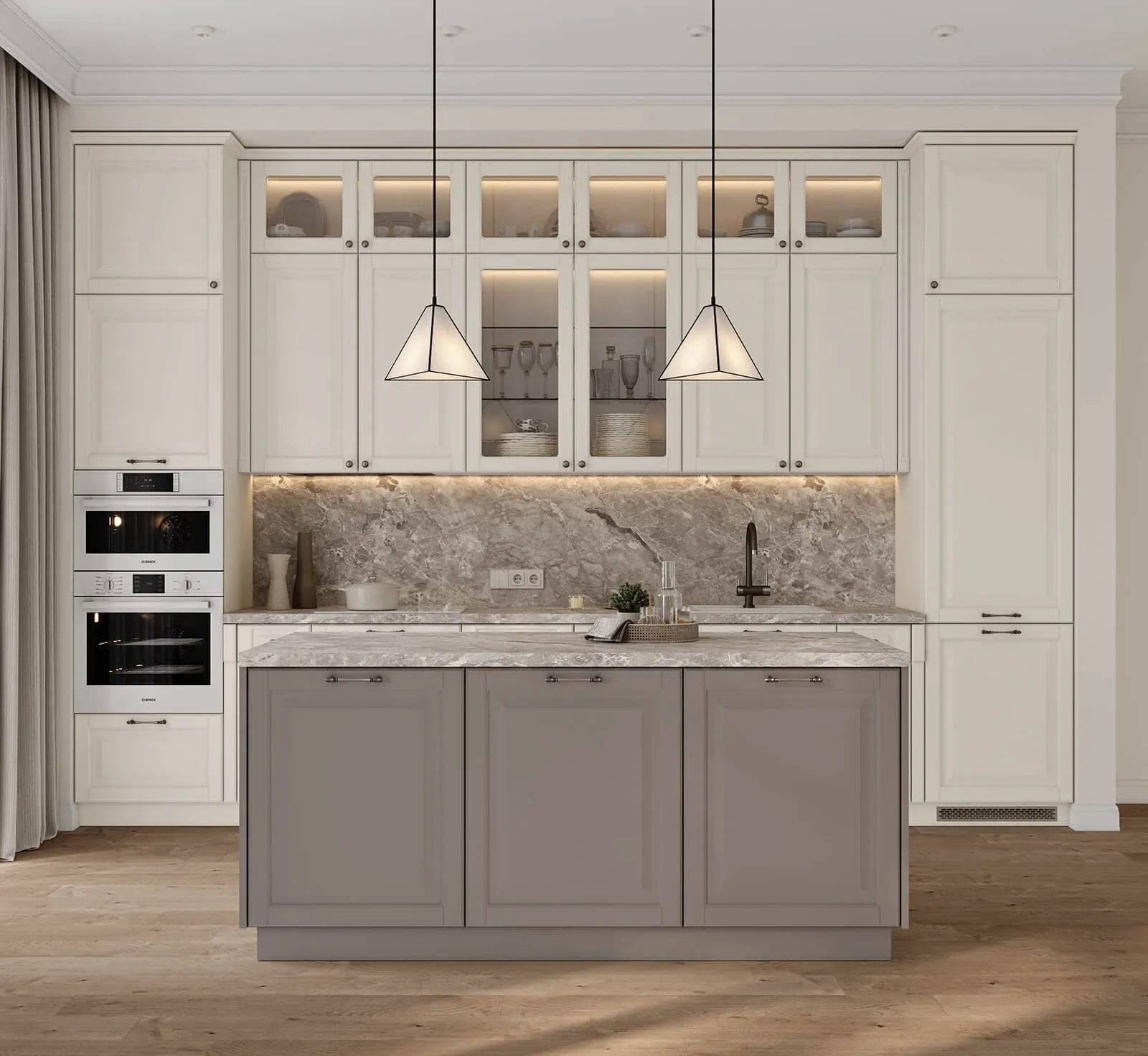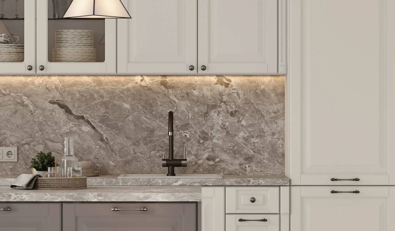 ФАСАДЫ Клайд (МДФ/ПВХ/PET), цвет Кубанит Серый Ф / Молочный PET СТОЛЕШНИЦА Пластик HPL, 38 мм, декор Римский Камень