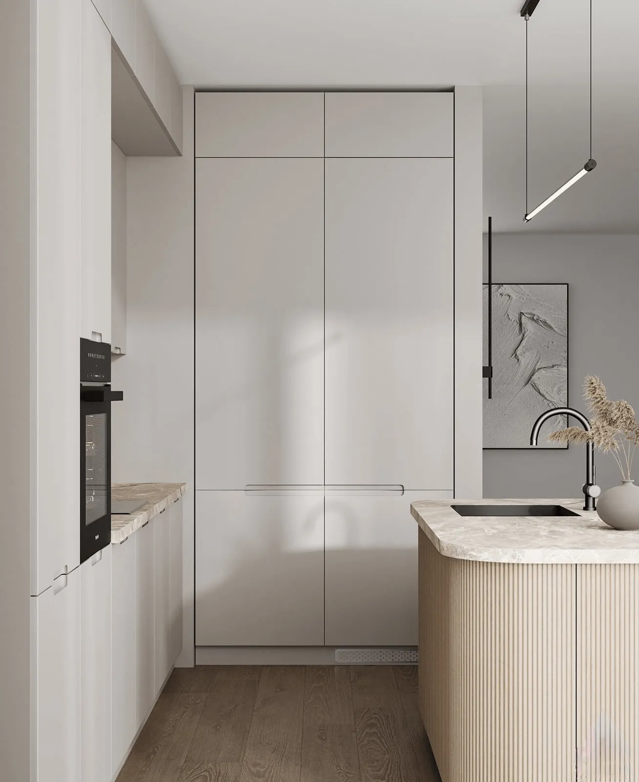 Фасады: ТТ622 Крашеная МДФ, цвет NCS S 1502-Y Матовый; T430 Массив дуба / шпон дуба, цвет #189 (воскобейц Белый).