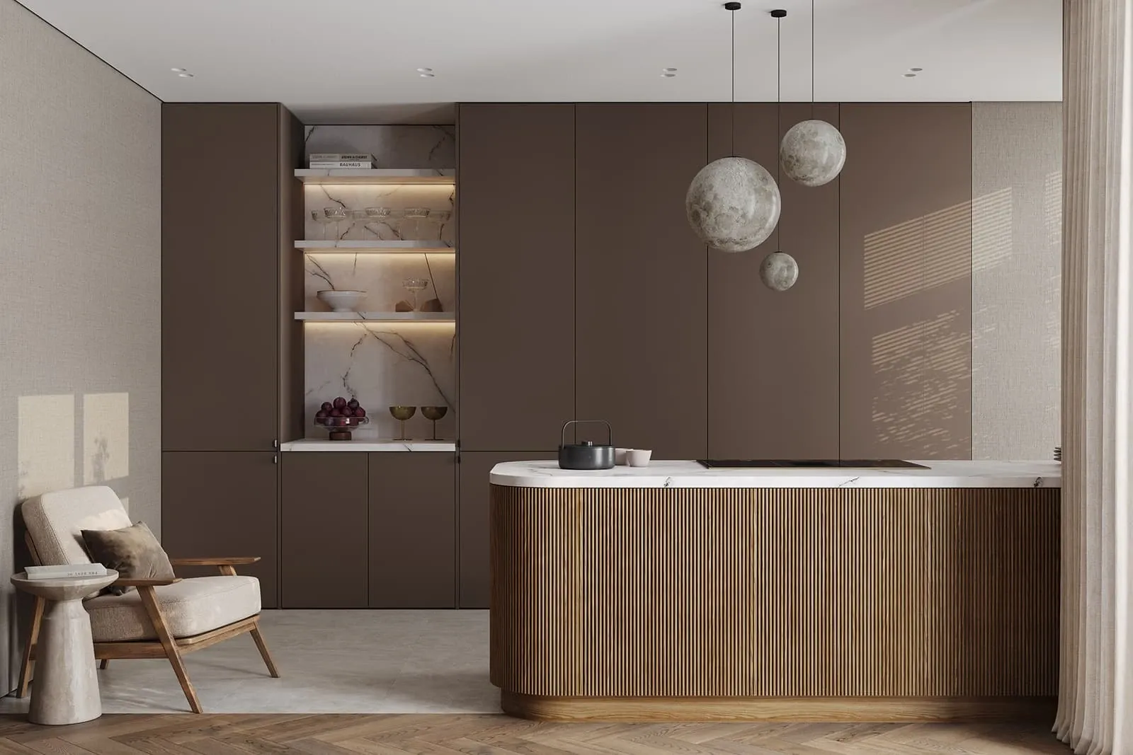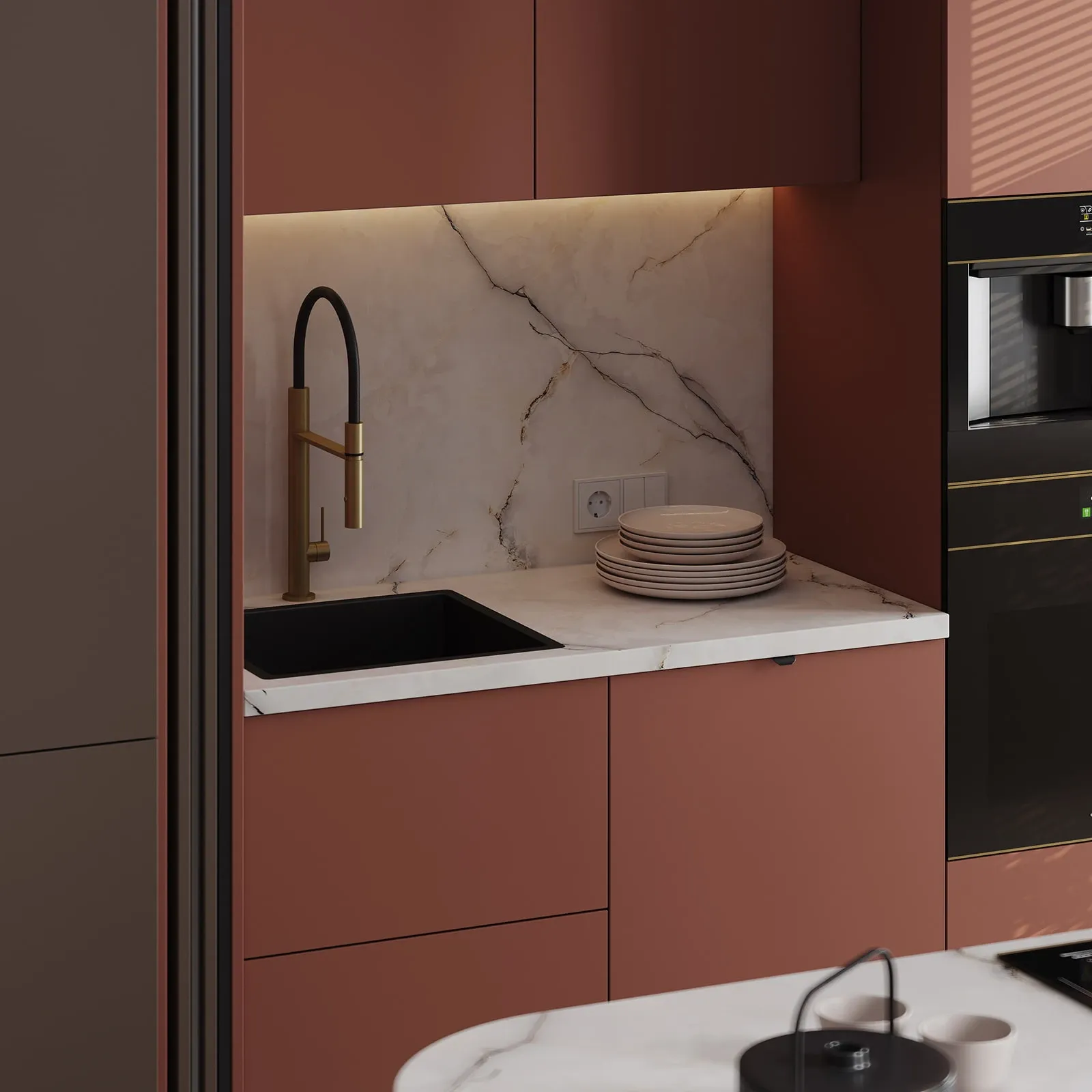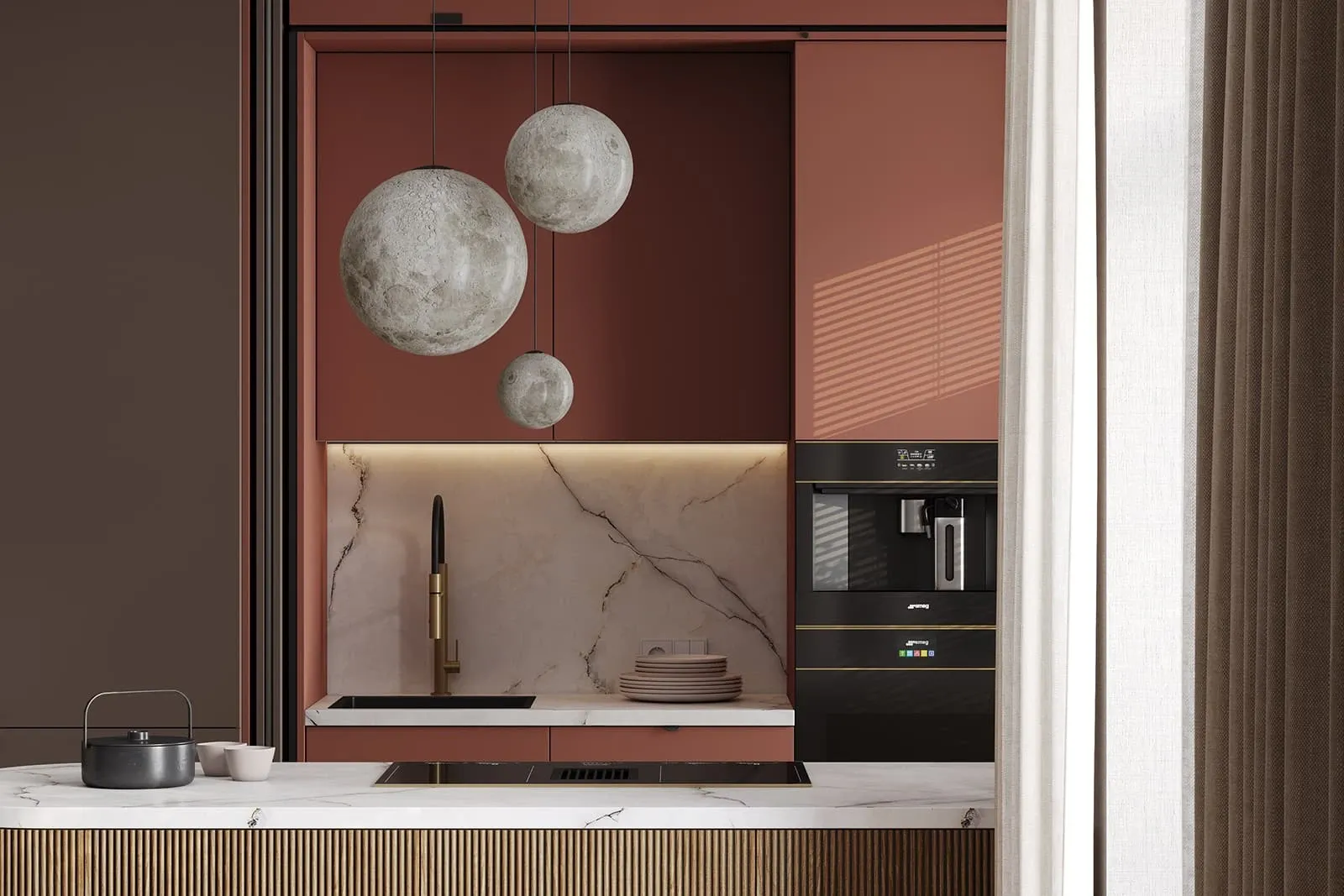 Фасады: ЛМДФ PRIME, цвет Камень Фундо / Терракота Тосканы; T430 Шпон дуба, цвет #111