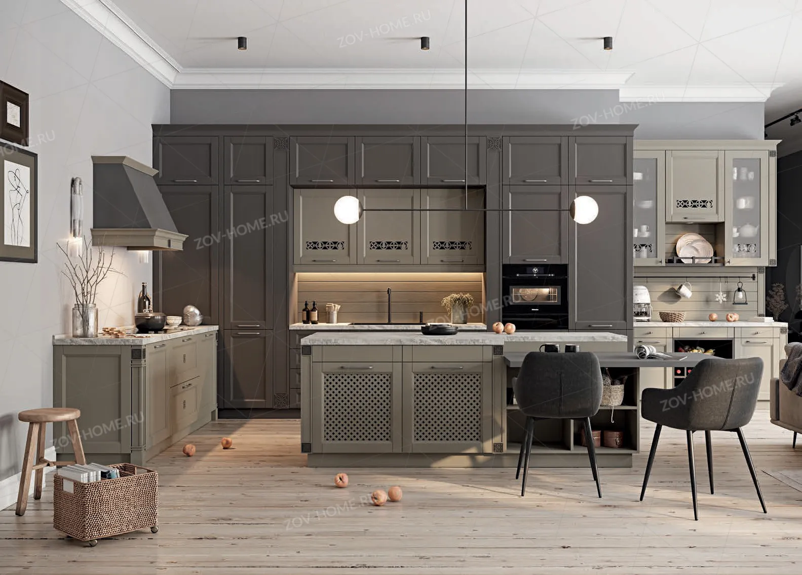 Декоративные элементы: Опора декоративная ОД-10 (820), цвет вставки 120; панель декоративная БПД-10-1; пилястра #13, цвет вставки 120; балюстрада прямая «Техно»; плинтус мебельный ПМ-5; багет ЛГБ-1 прямой; вагонка, цвет NCS S 6005-G80Y; декоративный короб HB «Пьемонт» (900) под встраиваемую вытяжку, цвет купола / вставки 120