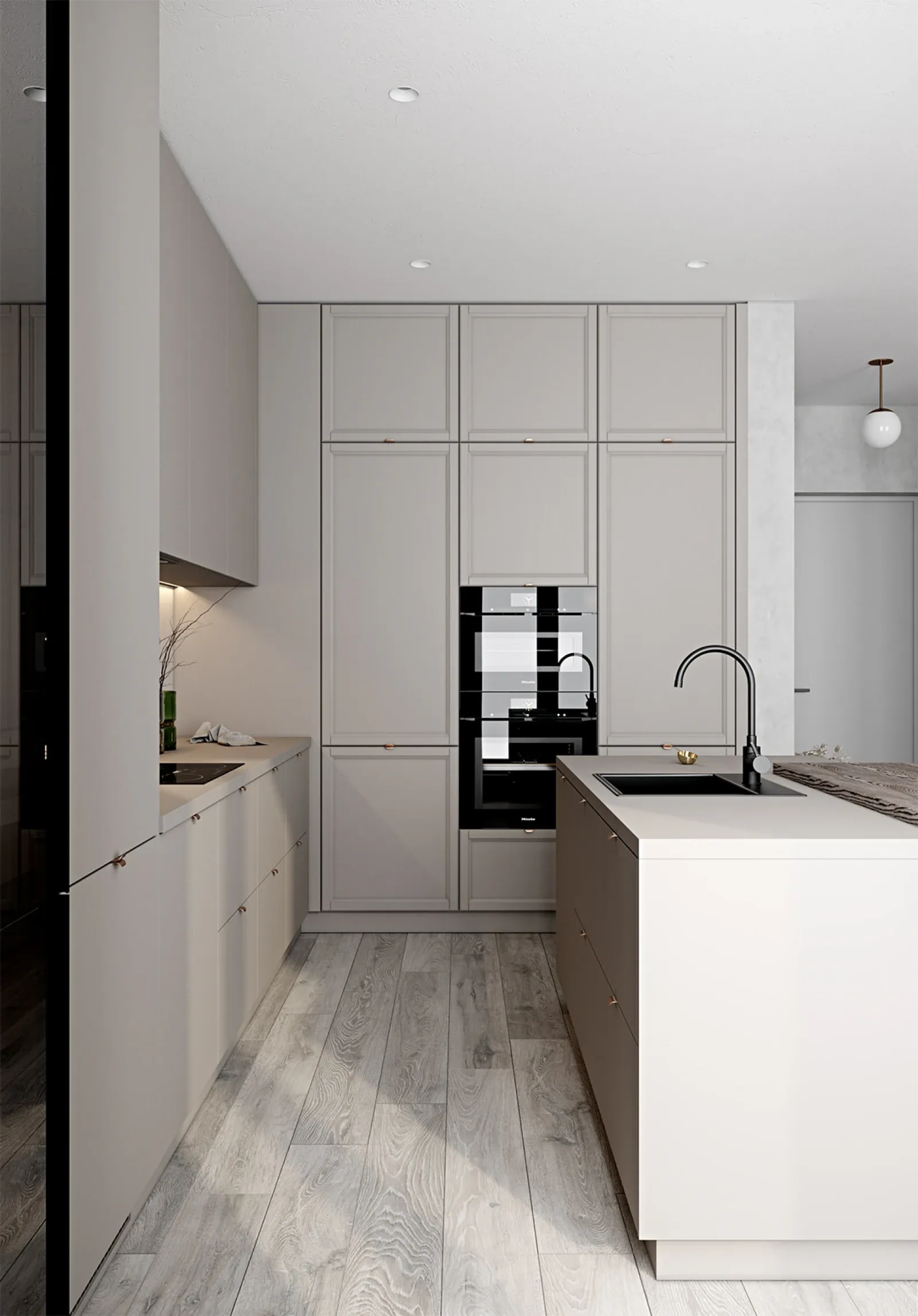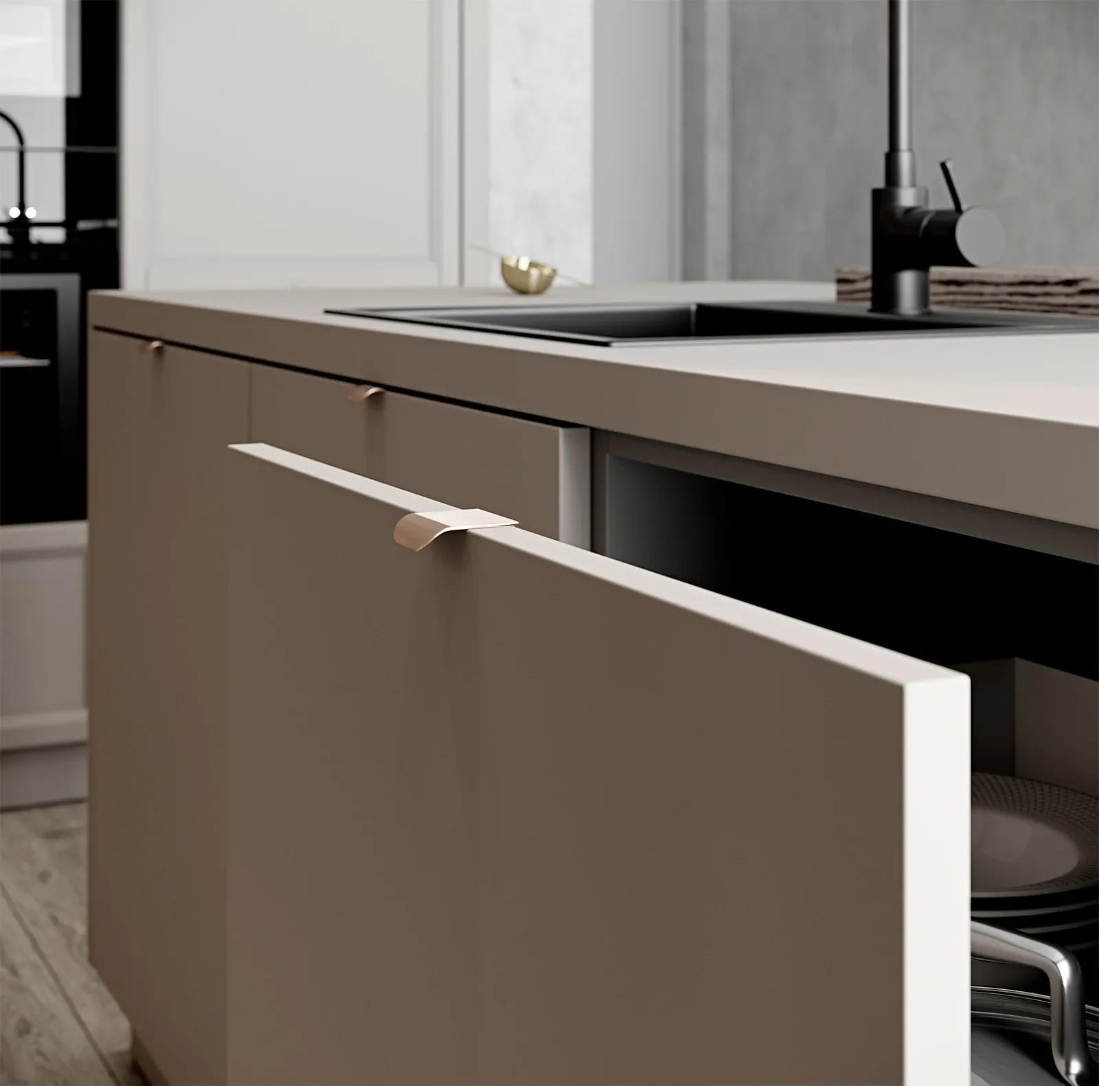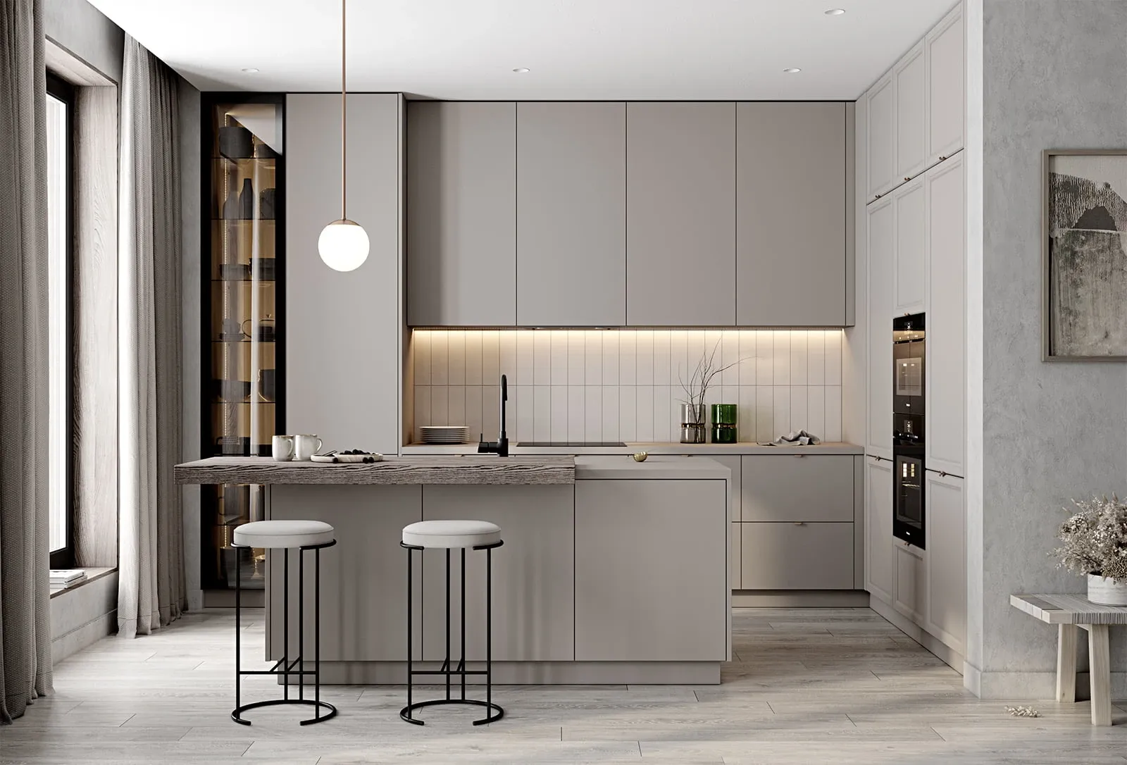 ФАСАДЫ Акрил Fenix NTM, цвет Серо-бежевый NTM (0748) / Т727 Натуральный дуб, цвет NCS S 3005-Y50R СТОЛЕШНИЦА Акрил Fenix NTM, 38 мм, цвет Серо-бежевый NTM (0748); МДФ/шпон ясеня, 70 мм, цвет #187 (масловоск Мореный Дуб)