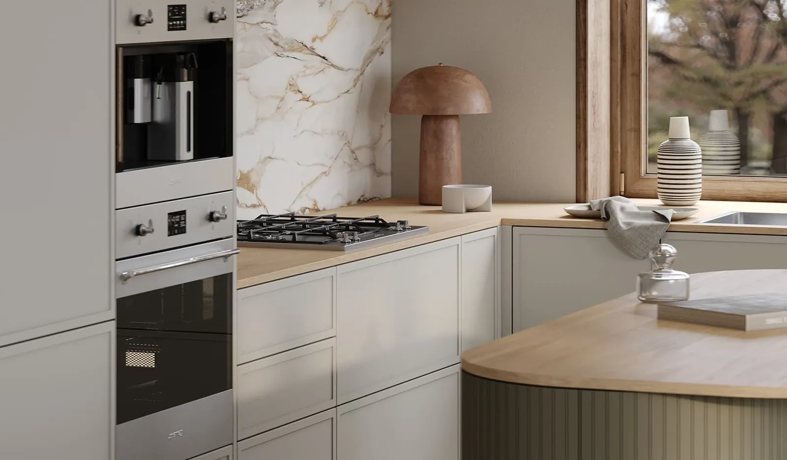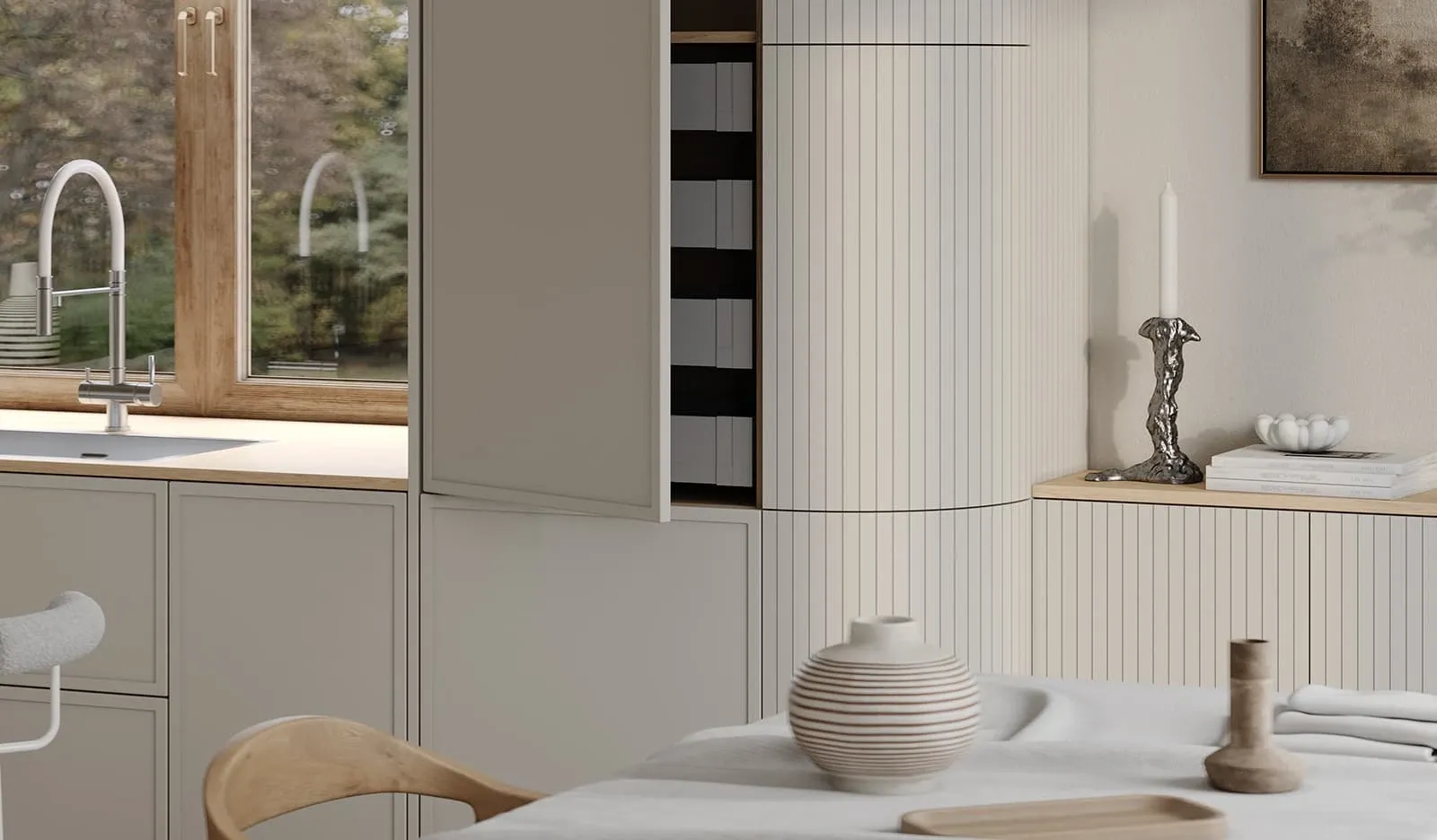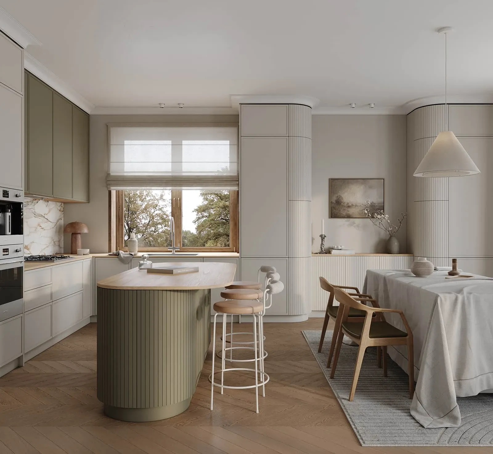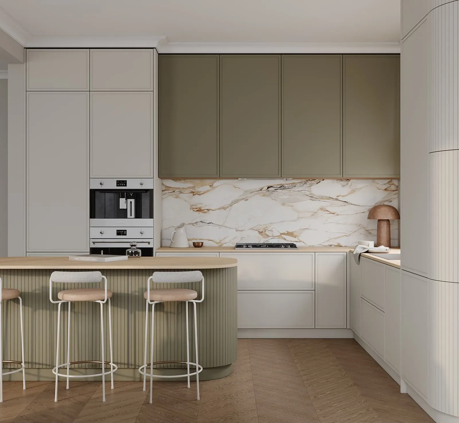 ФАСАДЫ Рокси (крашеная МДФ) / Аврора (крашеная МДФ), цвет NCS S 4020-G30Y Матовый / NCS S 1500-N Матовый СТОЛЕШНИЦА Пластик HPL, 20 мм