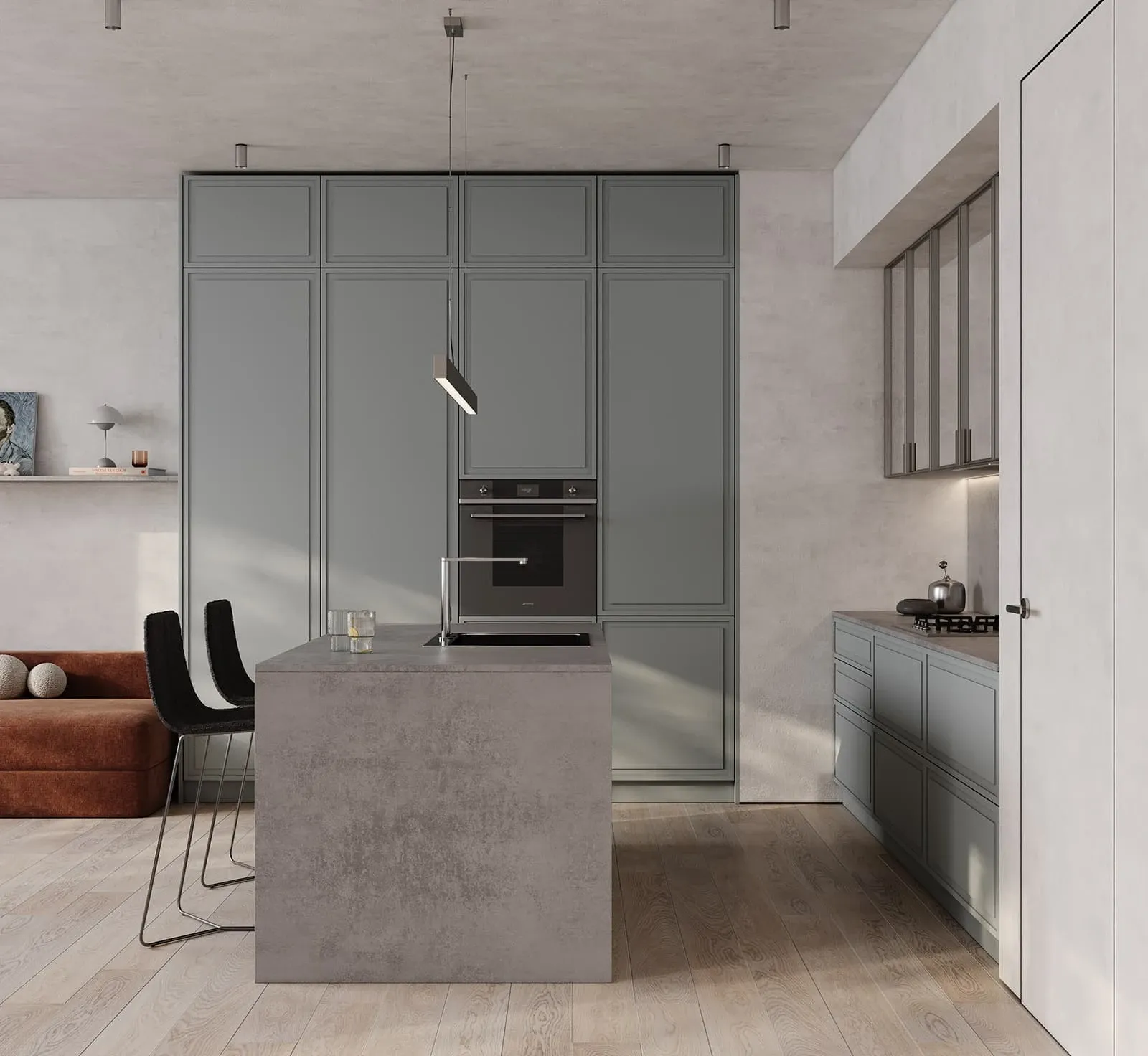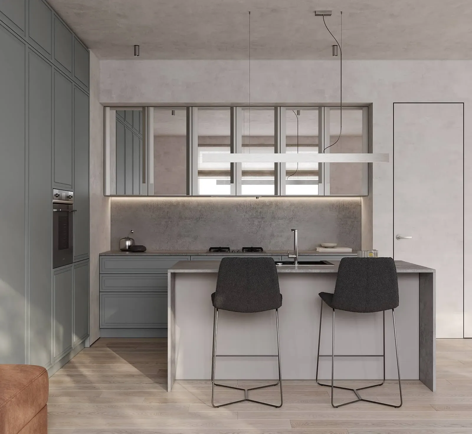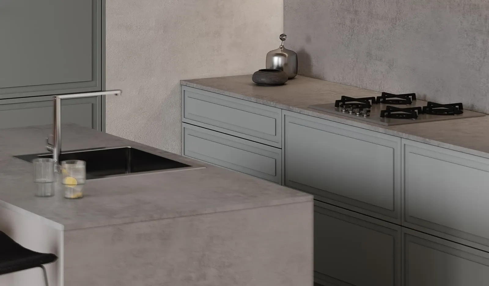 ФАСАДЫ Вестер (МДФ/ПВХ), цвет Фьорд / алюминиевый профиль А-4 Никель (ручка С-6) СТОЛЕШНИЦА Пластик HPL, 20 мм